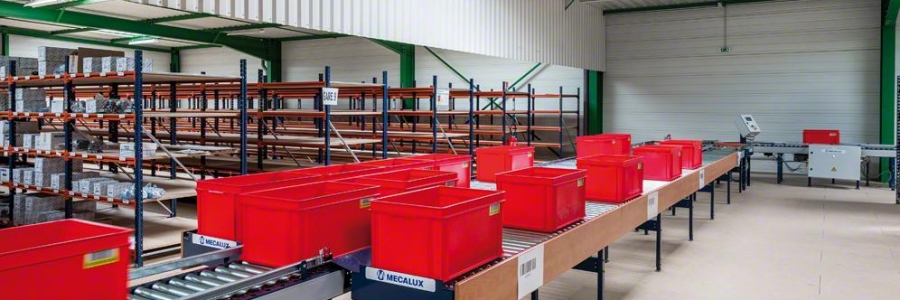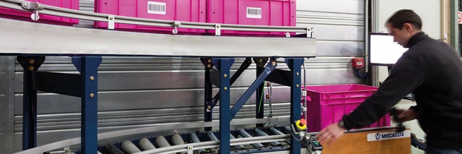Les postes de picking en forme de « U » sont adossés perpendiculairement aux convoyeurs principaux. Ces convoyeurs sont composés d’un circuit double qui permet à la fois la remise en circulation des caisses et la communication avec l’entrepôt et le poste de réapprovisionnement. Le convoyage des caisses vers un des deux convoyeurs principaux se fait directement, ce qui évite ainsi des mouvements superflus.